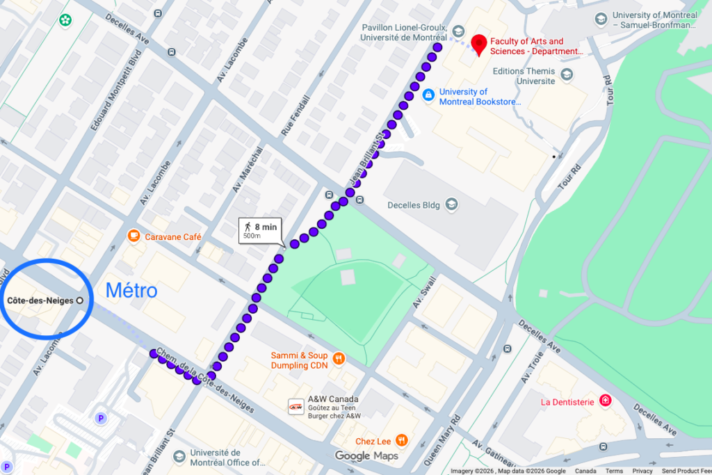 Trouvez ci-dessous le plan pour vous rendre au Carrefour des Arts et des Sciences de l’Université de Montréal, situé au 3150 rue Jean-Brillant (Montréal Québec, H3T 1N8). La station de métro la plus proche est Côte-des-Neiges.